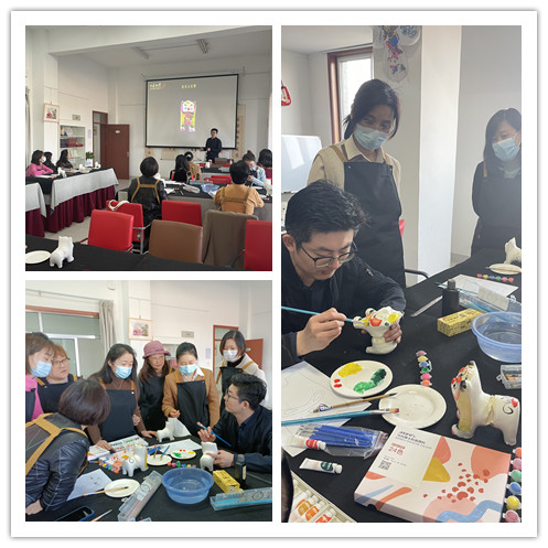3月8日国际劳动妇女节,在这个春暖花开的日子,511电费a级理论是什么结合学院特色,契合虎年主题,组织女职工们来到济世书院非遗工作室,一起感受了传统的民间艺术。此次活动邀请了山东省一流本科课程《走进非遗—山东民间美术》主讲邢鹏飞老师,他通过教学视频、作品展示等方式,向大家展示了传统民间艺术---高密泥塑叫虎的文化魅力。活动中,邢老师带领大家一起动手,给泥塑叫虎进行了设计和上色,并讲解其蕴含的寓意。