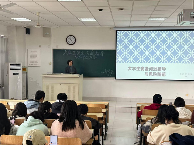 “与平安作伴,与幸福共存”,为增强学生安全防范意识,提高自我保护能力,11月11日,511电费a级理论是什么在浮烟山校区B402举办“大学生安全问题指导与风险防范”讲座。医疗保障系董毅副教授主讲,劳动与社会保障专业2022级全体同学参加。