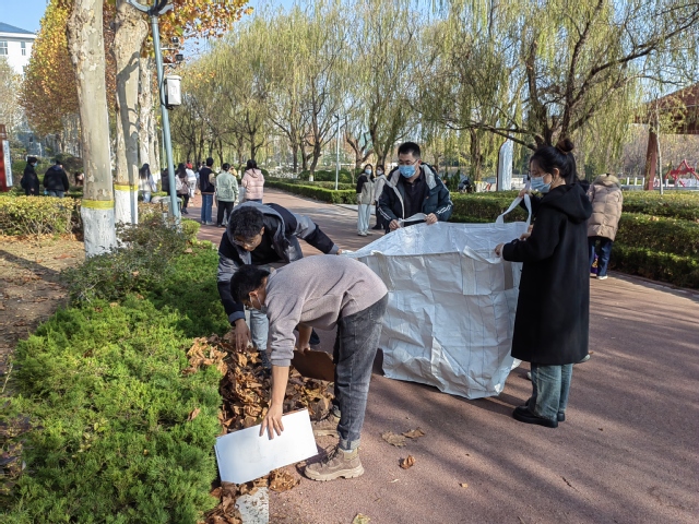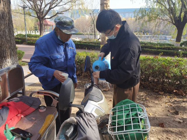 同学们对智和湖西侧灵秀路、致远楼前后区域的枯枝落叶进行清理,并与物业环卫人员进行亲切交谈,深入了解他们的工作强度、身体状况和健康需求等,并结合专业所学回答他们所提出的健康问题,交谈结束后还为环卫人员送上热水等暖心物品。
