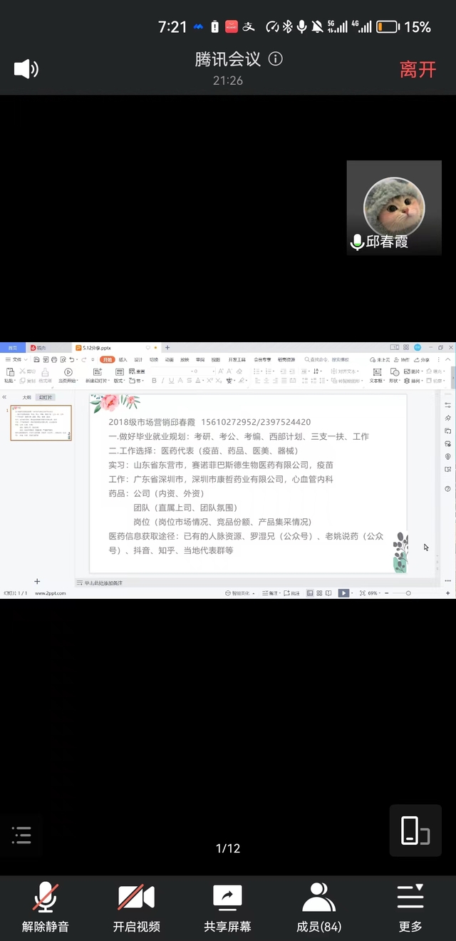 会议中,2017、2018级7位毕业生从各方面介绍相关的就业经验:于渤从就业区域的选择、确定就业目标、了解就业前景、以及从薪资及工作压力等方面,对比介绍国企与外企的区别;于迎蕾讲到简历的撰写与投递,着重提出在工作中要坚定内心的信念;王懿提醒同学们要加强对行业的认知及行业政策的了解;邱春霞从毕业生的规划讲到选择工作时要注重公司团队的氛围;莫海丽从面试、找工作的途径、单位的选择、岗位的选择四部分分享相关的经验;程山提醒大家面对挫折要保持自信和良好的心理状态;刘婷通过对不同行业内各公司之间的对比引导大家追随内心进行选择。