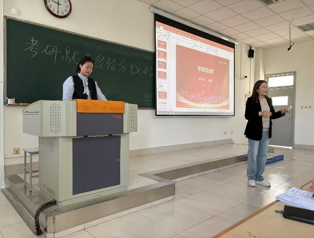 会议伊始,胡善菊老师上台致辞,隆重介绍了莅临现场指导的专业教师和考研、考公、考编、军队文职、出国留学成功上岸的5名应届毕业生代表,希望大家认真聆听,积极发问交流,通过汲取各位成功上岸学子的宝贵经验,拓宽就业路径,提高考研就业的成功率。