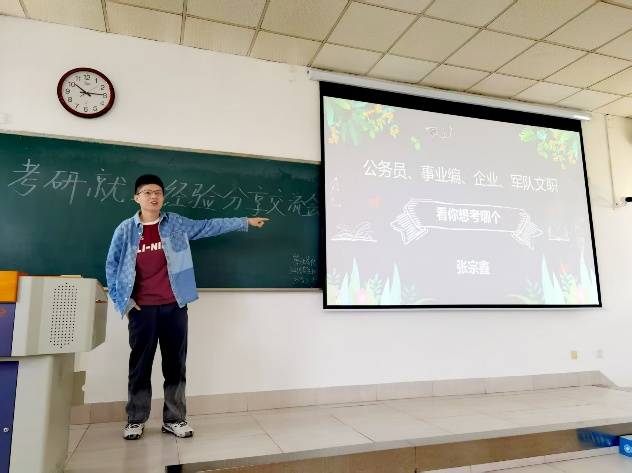 在经验分享环节,5名2025届毕业生代表依次上台,倾囊相授。考研代表史晨钰同学分别从考研院校与专业选择、公共课和专业课备考的时间规划、学习资料及学习方法等方面进行了细致的分享;考公、考编、军队文职代表孙佳辰、张宗鑫、胡志远三位同学分别结合自身经历,从行测和申论等的备考经验、刷题技巧、选岗技巧、面试等方面毫无保留地向大家传授了实用方法;出国留学代表于歌同学侧重讲述了留学国家和院校的选择以及备考策略与方法,就为什么出国留学、留学申请技巧等问题进行了详细解答。5名毕业生代表都从个人学习规划、复习资料与方法、心态调整、备考技巧等方面进行了全面而深入的讲解。本次活动还设置了问答环节,与会老师和同学们认真聆听,积极发问,主讲同学细心讲解,会议现场气氛热烈,高潮迭起,交流分享时间持续三个多小时。